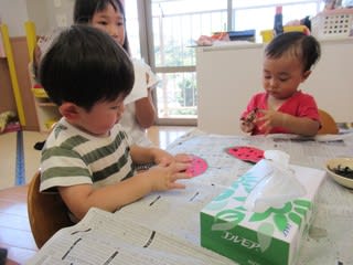 1.2歳児さんの部屋を覗いてみると夏の製作が行われていましたよ