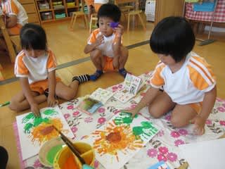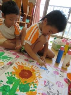 ペタペタとたくさん手形を付けて出来上がったものは「ひまわり」でした