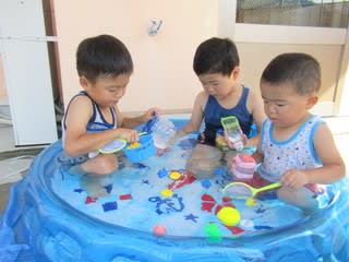 暑すぎると長時間の外遊びは危険ですが、これは最高!!とばかりに遊び始めた子どもたち。