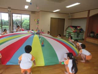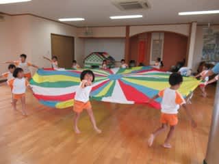 バルーン遊びに挑戦しました!持ち方も年長組がしっかり教えてくれて楽しく行うことができましたよ