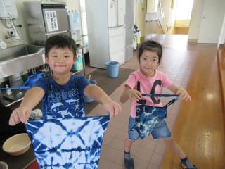 ビー玉や割りばしを使って模様を付けた後は水につけて、染めて、色が落ちないようにして等 と全ての工程をさせていただきました。