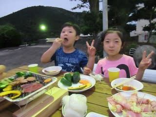 夕食後は、夜のお散歩。真っ暗の中、懐中電灯を持ってどんどん歩いていきキリギリスを見つけたりかぶと虫を探したりと頼もしいスタートでした