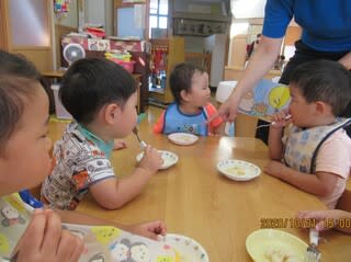 園庭で遊んでいた2歳児さん?最近は、保育園の食前のごあいさつがブームになっているようです(*^^)v だから、園庭でおままごとをしている時は、ご欄のように『お手々を合わせてください。はい、ごあいさつ。神さま、おとうさん、…