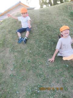 「キャハハハッ」と歓声が聞こえる方へ向かうと、芝山で滑り台。