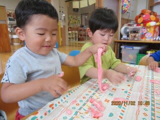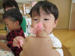 この日はピンク色にした小麦粉粘土に挑戦しました!