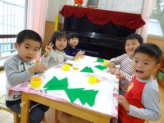 自分達でどんなツリーにしようかな?と考えながら切ったり、貼ったりしました!