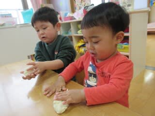 1歳児クラスは久しぶりに小麦粉粘土をやってみました!