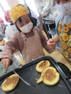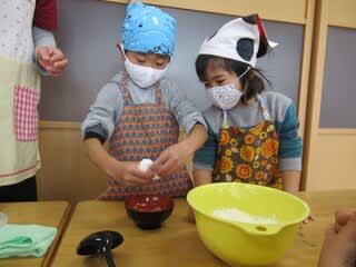 まずは生地作り。卵も年長組が上手に割ってみんなでまぜまぜ♡