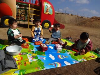 「これ作ろうよ」と子どもたちからの提案で、5歳児さんはどろだんご作りのスタート 本を見ながら作る・・・ということで園庭にまで本を持って行く子どもたち さて、できるかな・・・? 一つひとつ、工程を確かめながら作っていきます…