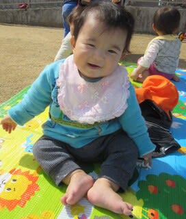 晴れたり、雨が降ったりしている今日この頃ですが、0歳児さんも天気が良い日は戸外へ。