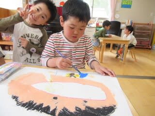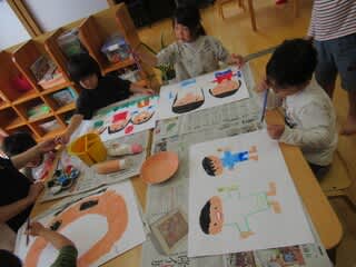「笑ってる方がいいよね」「ここも塗った方がいいよ」など子ども達同士で話しながら絵の具で塗っている子どもたち。