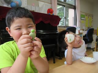 ちょうどその日の朝、お友達がそら豆を届けてくれて皮むきをした子ども達。