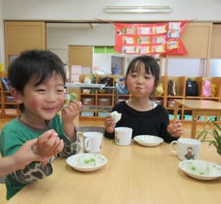 おやつの時間「枝豆ごはんのおにぎり」を食べました。