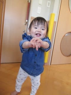 0歳児さんのお部屋を覗くと、自分で立つところを見せてくれました。