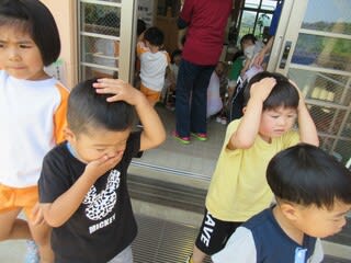 火災訓練と違って、煙を吸い込まないように…と言うよりは頭を守りながら避難している姿には感心です。