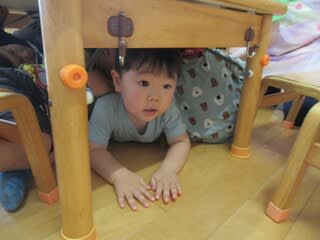 保育士に促されテーブルの下や、布団をかぶったり…とそれぞれ身を守る行動開始!!
