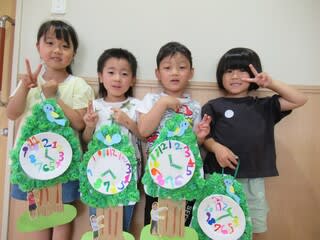 子どもたちはそれぞれのクラスで時計の針はいくつあるのか、数字はいくつあるのか、時計がなかったら・・・などいろんなお話をしながら制作しました