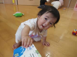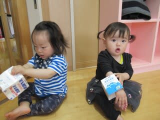 牛乳パックを切っていたら、これ何?というかのように集まってきた0歳児さん。