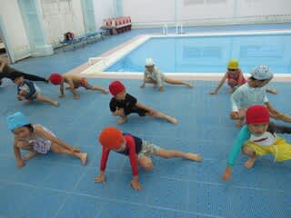 先日、以上児はプールへ行ってきましたみんなで準備体操を行った後はプールの中へ