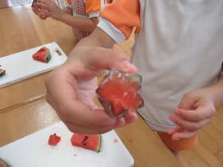 今日は、昼食のデザートのすいかに少しだけアレンジしてみました