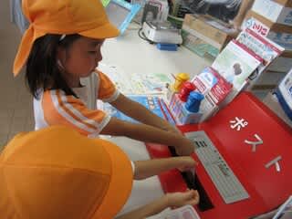 それぞれのクラスで描いた暑中お見舞いのはがきの一部をポストへ投函