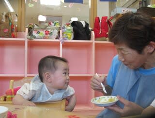 「もぐもぐ美味しいね♡」こちらが照れてしまうほどじーっと見つめてくれる0歳児さん。
