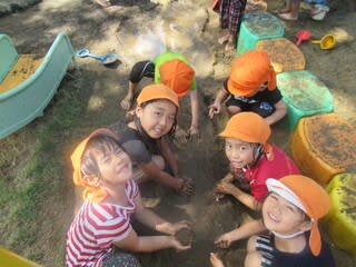 水の流れる道を作ってみたり、大きなお山を作ったりと砂場の中でも外でもダイナミックに遊んでいる子どもたちでした