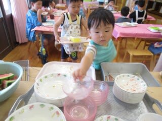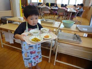 3歳以上児さんは、毎日自分の給食は自分で配膳していますが、この日は交流に来ていた2歳児さんも挑戦