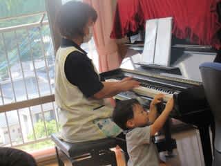 職員と共にリズミカルな伴奏を0歳児さんもお手伝い