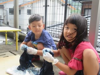 まず初めの藍染め体験では、模様をつけ藍染め液へ付けると緑色へ・・・しかし、取り出して輪ゴム等を外しているうちにだんだん藍色へと変化していき、びっくりしている子どもたち。