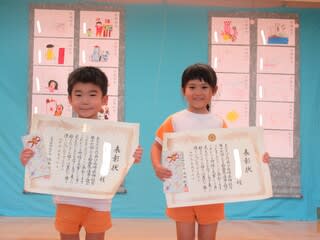 全体お始まりで表彰して頂いたお友達。大きな賞状にニッコリ