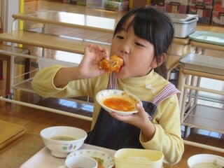 普段は、お皿を持って箸で頂く給食も、たまにはこうやって「かぶりつく」ことも