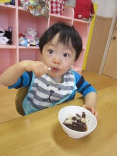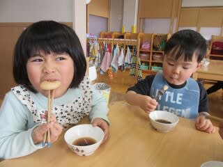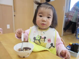 鏡開きですね。子どもたちはおやつの時間にぜんざいを食べました。