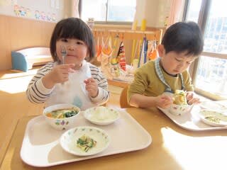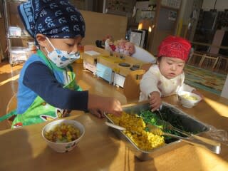 1、2歳児さんは、昼食のラーメンを自分たちで盛り付けしました。