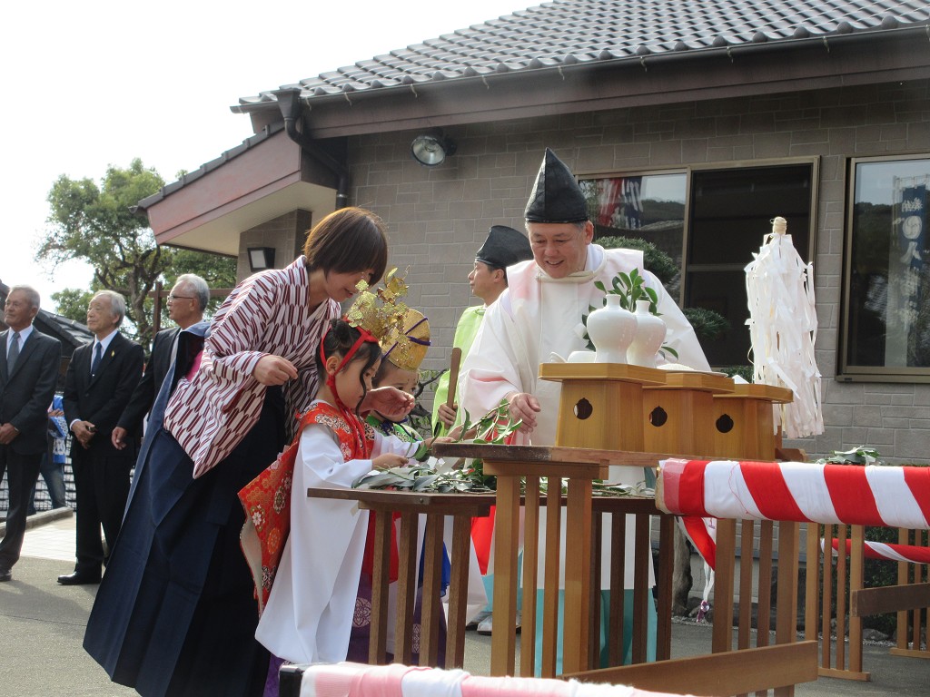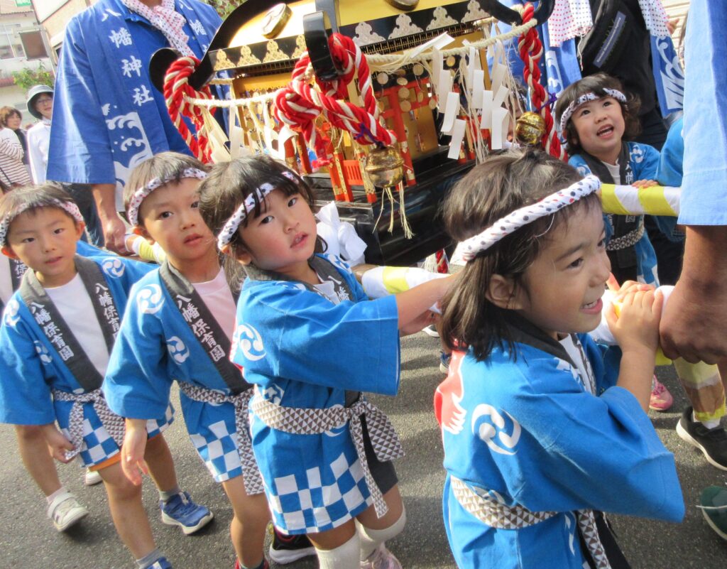 八幡神社大祭の2日目は、4歳児が神輿を担ぎ5歳児が稚児行列に参加しました。