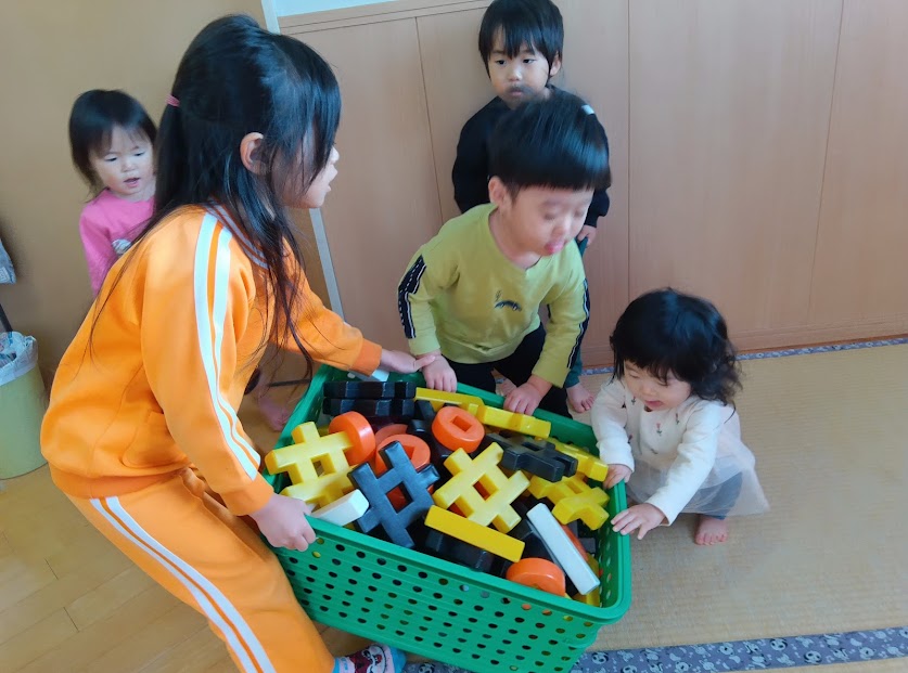 みんなで遊んだ玩具を片付けて運んでいたら、一番小さなクラスのお友だちも自分もやってみる~!と言うようにお手伝いをしてくれました(*^_^*)