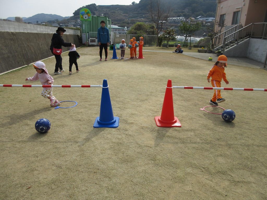 ボールを使っての運動では、進級を控えた2歳児さんもちょっとだけ参加させてもらいました😊2枚の画像は、最後の体育教室になった5歳児さんと、4月から新たに体育教室に参加する2歳児さん。何事も引き継がれていきますね🌼