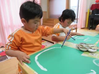 3歳児さんは、絵の具を持ってグルグルとお絵描き中。