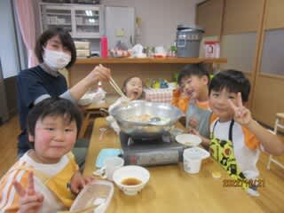 食材の色や形の変化を楽しむ他にも、ぐつぐつ揺れる食材を見て、「豆腐が踊ってるみたい」など可愛らしい言葉も♡たくさんあったお野菜もあっという間に完食の子どもたちでした。