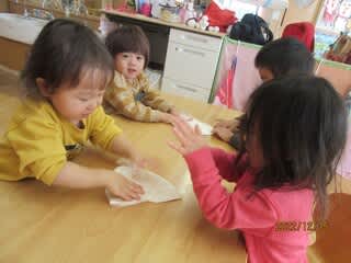 感触を楽しむことはもちろんですが、手のひらにのせて丸めたり、ギュッギュと丸めたり1・2歳児さんなりに丸く丸めることができました