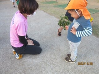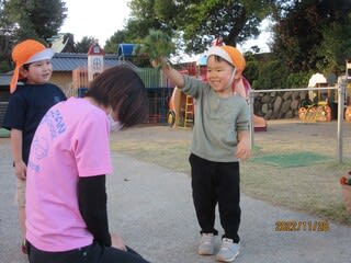 先日の夕方、外遊びの最中に、園庭に落ちていた葉のついた枝を集めて「せんせい、こっちに来て~」と。