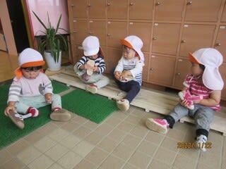 靴下を履いたり、帽子をかぶったりと、保育士の手を借りながらもできることは自分でしてます