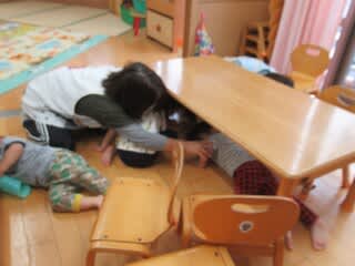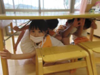 地震の訓練中で、身を守るために机の下に一時避難をしているところでした。