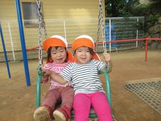 「一緒にブランコのろ~」と半分席を空けてくれたお友達と、にっこり笑顔でうなづいたお友だち♪