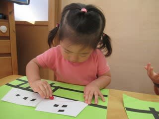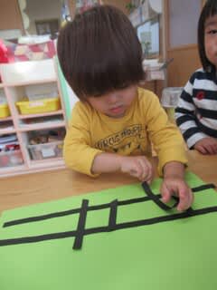 ハサミで、チョッキン✂と切ると、「線路は、こうなっとったよね~?」と貼りました(^^♪