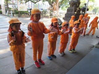 しばらく走ると、だんだん道が悪いので「ごっつんこ」しないように支え合う子どもたちです