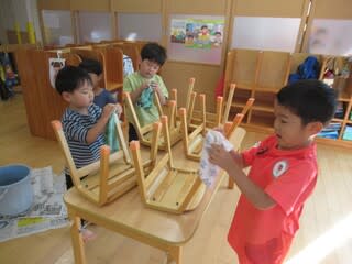 普段使っている椅子や机、自分のロッカーなどを水拭きしました(^^♪