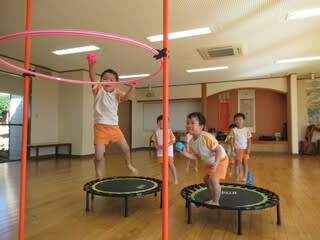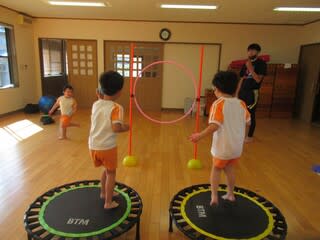 トランポリンを使った体育教室では、跳びながら投げることにチャレンジ!!