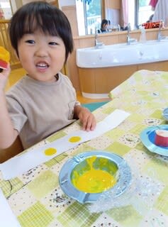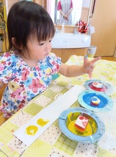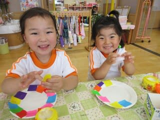 3歳児さんは、ハサミで折り紙を切ると、紙皿にペタペタ。