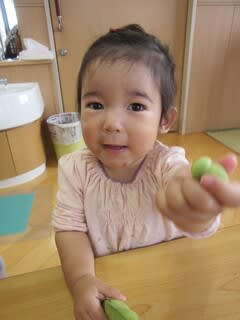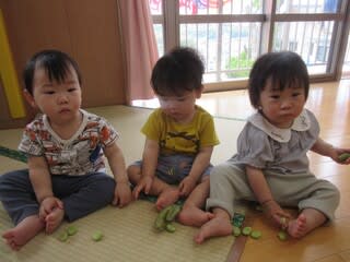 皮の中から顔を出したそら豆を手に持つと、出たよ~とにこにこの子どもたちです